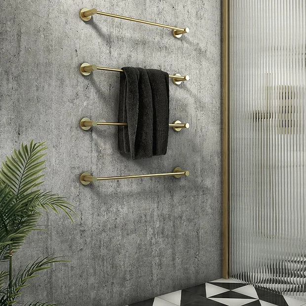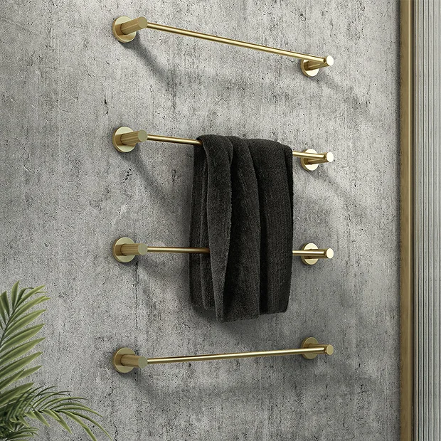 The stylish and practical wall mounted Arezzo 4-Bar Industrial Style Brushed Brass towel rail features a minimalist round design which integrates seamlessly into any modern bathroom. This set consists of 4 individual rails each measuring 540mm in length, the spacing between each rail is fully adjustable to suit your preference. Crafted to the highest standards, the towel rail features knurled detailing perfect for creating an eye catching industrial look in your bathroom.