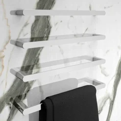 The stylish decorative Arezzo white terrazzo round bathroom side/end table features classic minimalist clean lines. Supplied with a supporting brushed brass round steel rail frame, perfect for creating a stunning, fashionable, and chic bathroom interior. This modern bath table is great for keeping your bathroom products and accessories nearby.