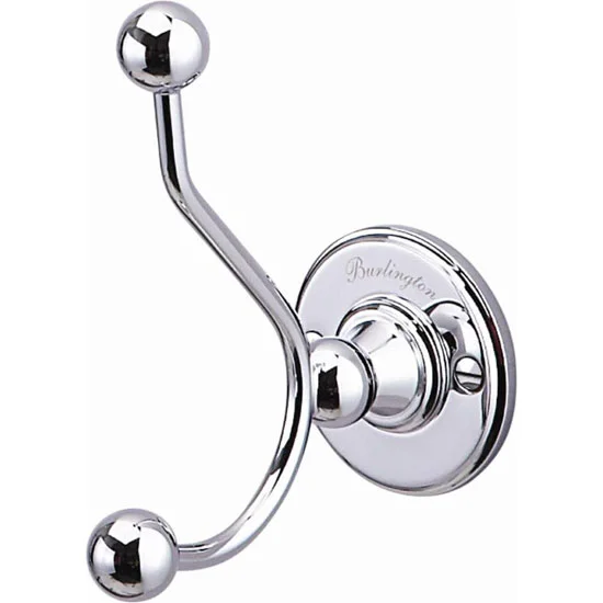 This double robe hook is part of the Burlington range of accessories. Burlingtons products are all designed with a traditional theme. This product has a high quality chrome finish and provides a sturdy excellent storage option.