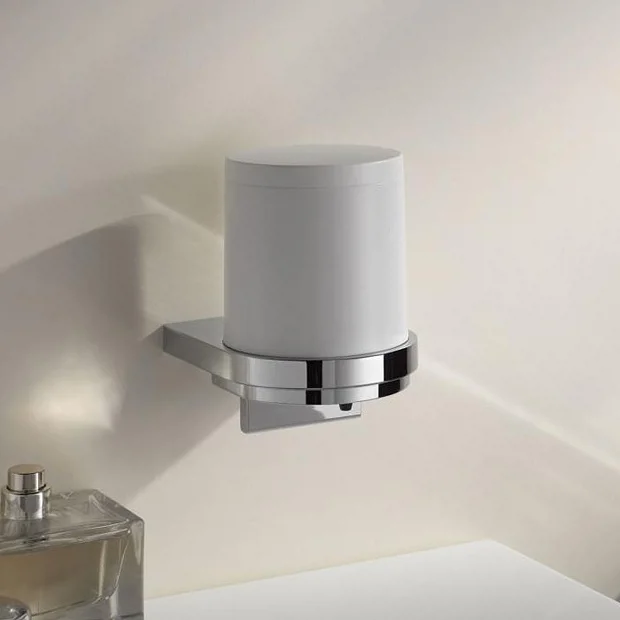 The Moll collection from Keuco offers a generous range of bathroom accessories for an attractive bathroom design style. This wall mounted soap dispenser features an esthetic design with a slightly rounded edged chrome bracket and a matt white dispenser.