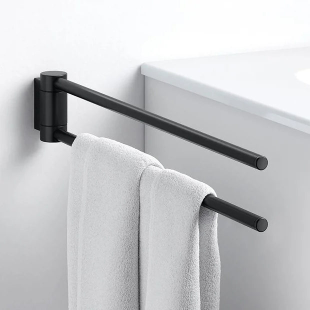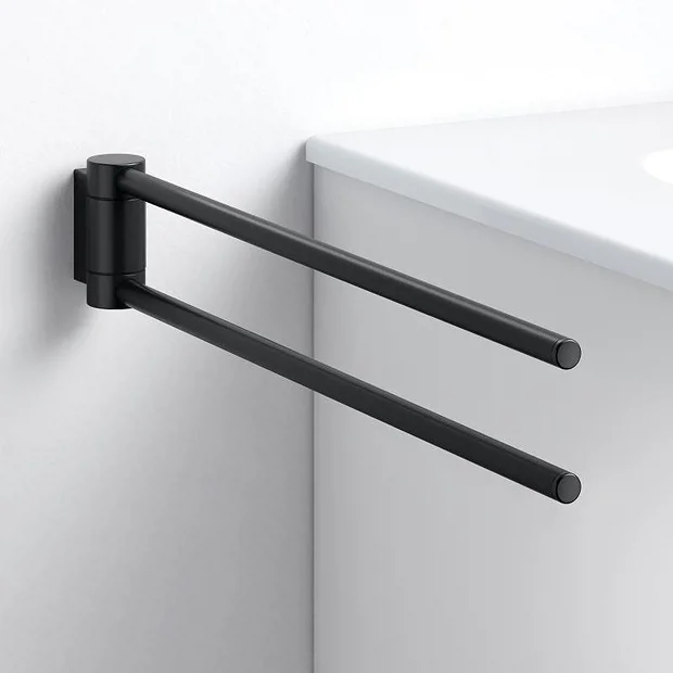 Functional and stylish, the Keuco Plan accessory range offers a wide collection of practical products to choose from. This Double Swivel Towel Rail comes in a stylish yet functional design and has independent laterally swiveling arms. Made from premium materials with a sleek matt black finish.