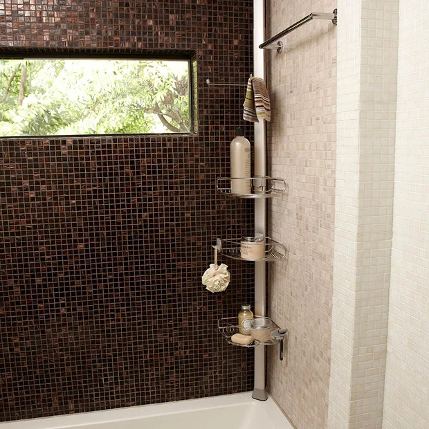 Keep your shower or bath space clutter free with the simplehuman Tension Shower Caddy. No tools are needed to install as the reinforced aluminium pole features a high-compression spring and grippy rubber feet that fits the caddy securely between your floor and ceiling. The wire frame shelves are adjustable sliding up and down for space-efficient storage. It’s stainless steel and anodised aluminium construction makes it tough, robust and rust resistant.
